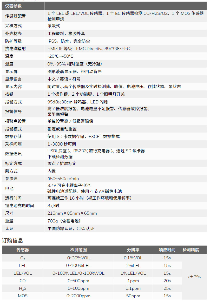 | 类型 | 可燃气体 LEL |